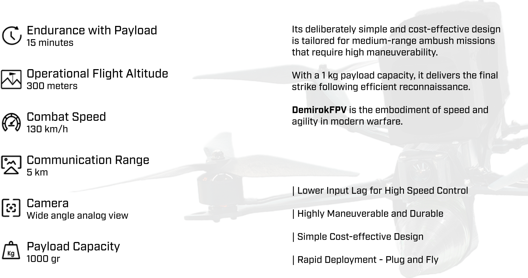 Developed from our field-proven experience with DemirokFPV, this platform is engineered to ensure absolute superiority against jamming and electronic warfare threats on the modern battlefield.