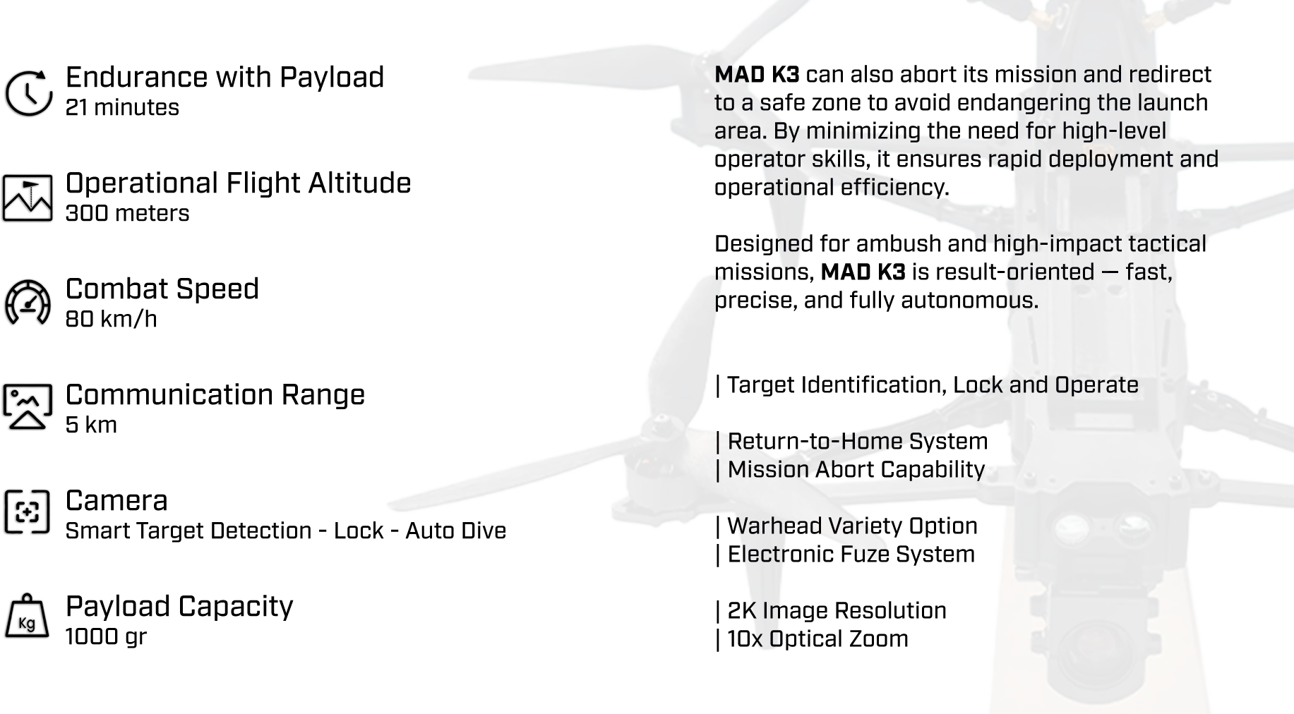 MAD K3 is an autonomous loitering munition capable of detecting and classifying targets — from heavily armored to lightly armored vehicles, including personnel — using advanced image processing algorithms.