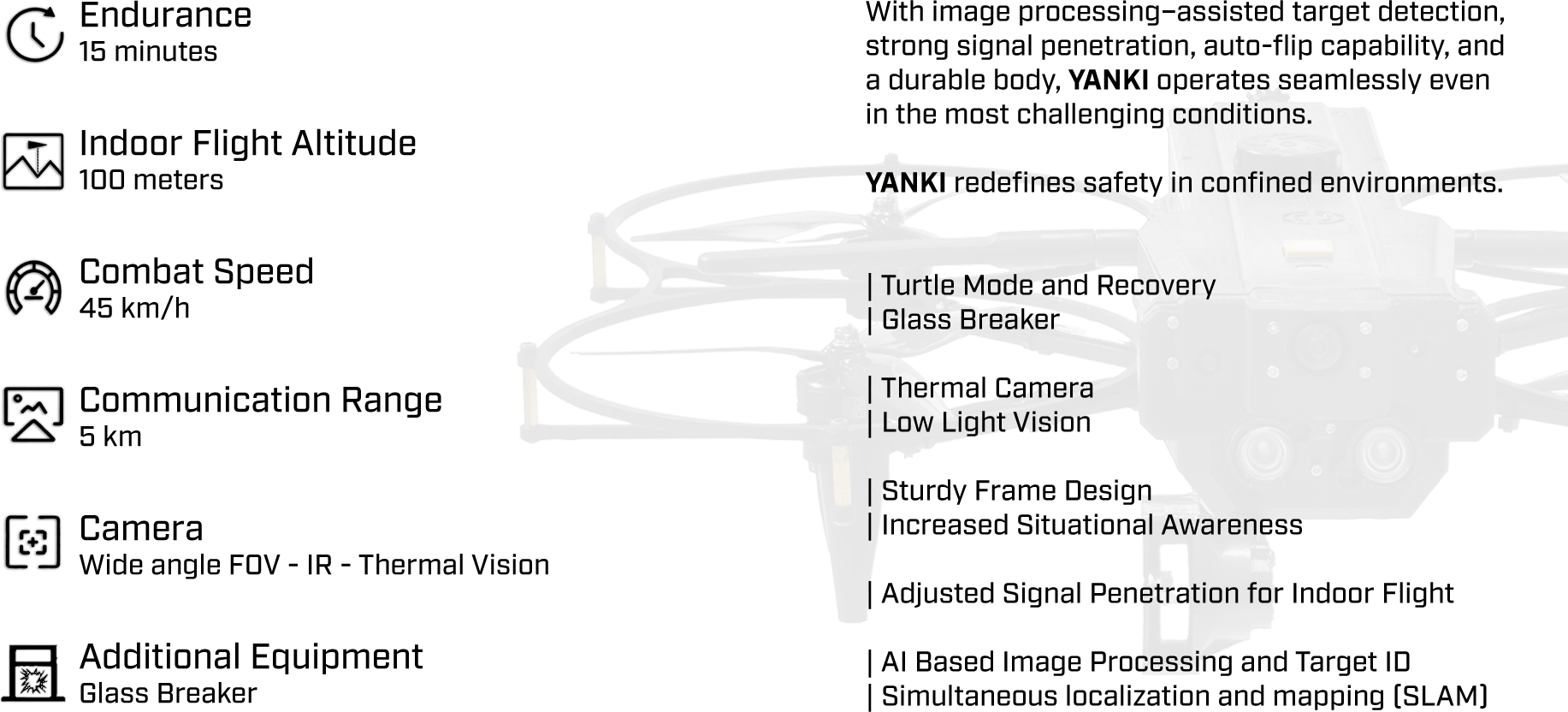 YANKI is an autonomous indoor UAV developed for close-quarters operations and designed to work in coordination with law enforcement units.